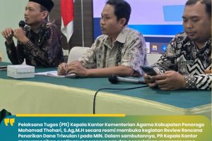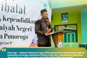 Ponorogo — Pejabat Pelaksana Tugas (Plt) Kepala Kantor Kementerian Agama Kabupaten Ponorogo, Mohamad Thohari, S.Ag., M.H., memberikan sambutan sekaligus pembinaan dalam kegiatan Halal Bihalal Pendidik dan Tenaga Kependidikan Madrasah Ibtidaiyah Negeri (MIN) se-Kabupaten Ponorogo. Kegiatan tersebut berlangsung dengan penuh khidmat serta diwarnai suasana hangat dan kekeluargaan. Dalam sambutannya, Mohamad Thohari menyampaikan apresiasi dan terima kasih…