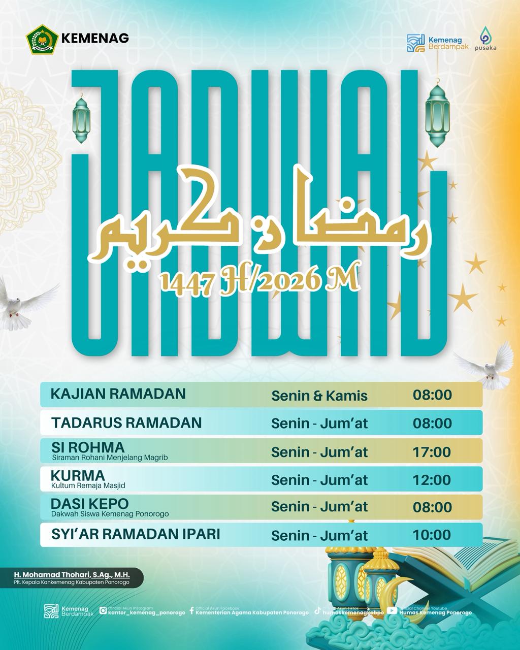 BimasBimas Islam 20/02/2026 π Jadwal Kegiatan Ramadan 1447H / 2026M Kementerian Agama Kabupaten Ponorogo Ponorogo, Februari 2026 β Menyambut datangnya bulan suci Ramadan 1447 Hijriah…