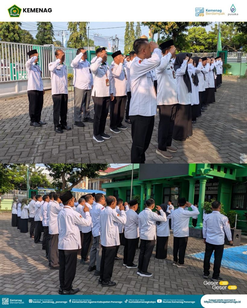 Ponorogo — Apel pagi yang dirangkaikan dengan penyerahan Surat Keputusan (SK) Kenaikan Pangkat bagi Aparatur Sipil Negara (ASN) Kementerian Agama Kabupaten Ponorogo dilaksanakan pada Senin, 6 April 2026 di halaman Kantor Kementerian Agama Kabupaten Ponorogo. Kegiatan ini berlangsung dengan tertib dan penuh khidmat, diikuti oleh seluruh pegawai di lingkungan kantor tersebut.
