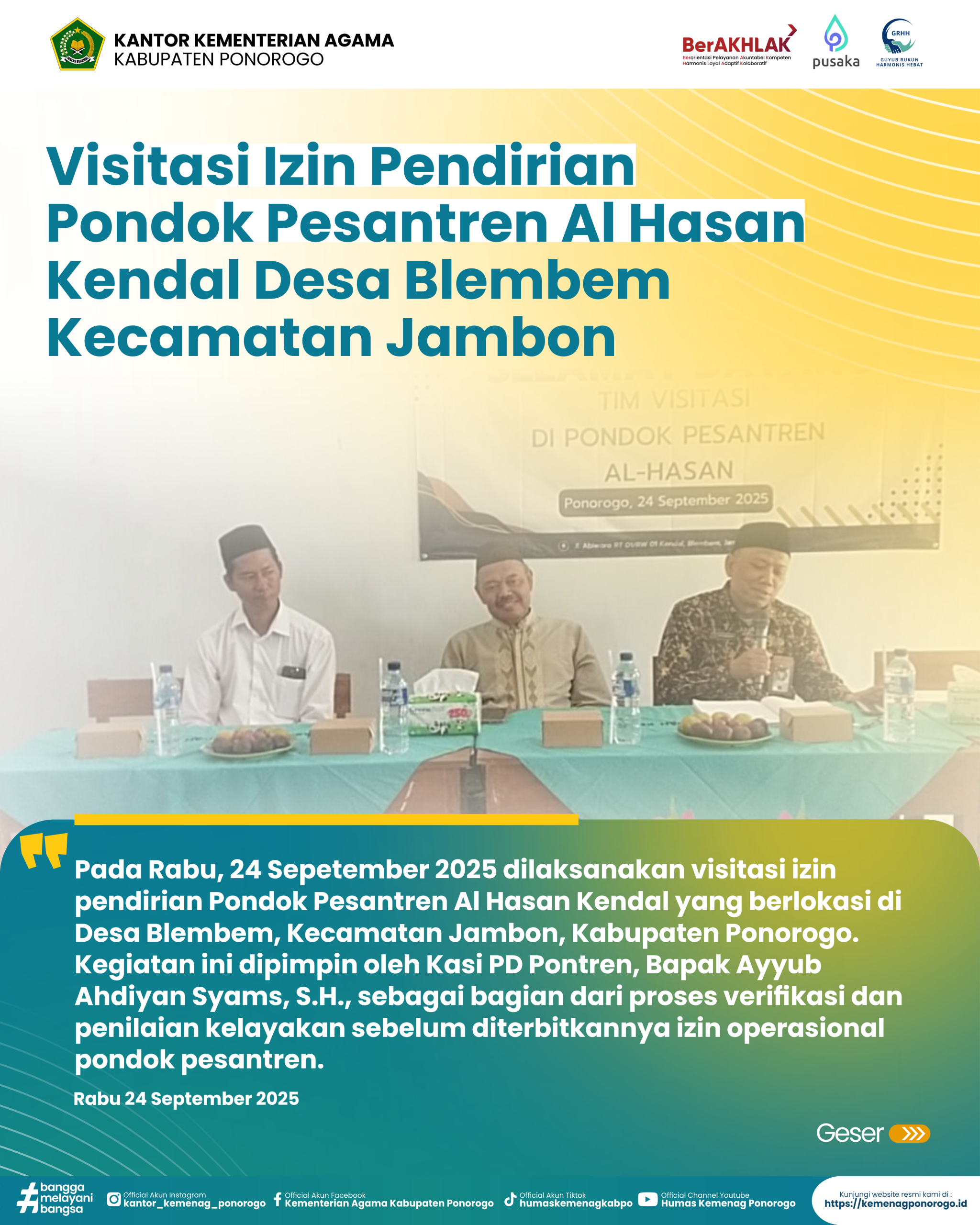 Dr. Moh. Nurul Huda, M.Pd., Kepala Kankemenag Kabupaten Ponorogo, melaksanakan monitoring dan evaluasi pelaksanaan Asesmen Nasional Berbasis Komputer (ANBK) di MIN 3 dan MIN 6 Ponorogo. Dalam kunjungan ini beliau menegaskan pentingnya ANBK sebagai sarana untuk memotret kualitas pendidikan, bukan sekadar ujian, namun bagian dari upaya meningkatkan mutu pembelajaran di madrasah. ✨📚 Semoga hasil ANBK…