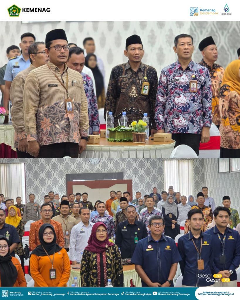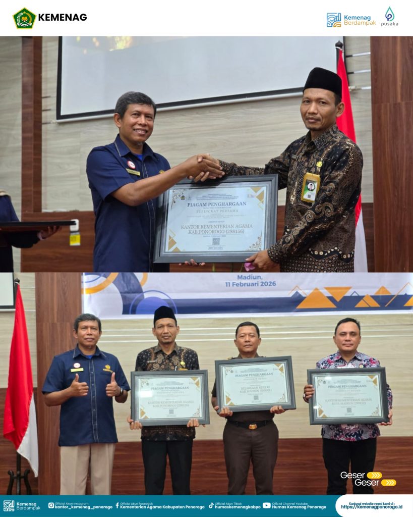 Dalam kegiatan tersebut, Plt. Kepala Kantor Kementerian Agama Kabupaten Ponorogo, Mohamad Thohari, S.Ag., M.H., turut hadir secara langsung sebagai Kuasa Pengguna Anggaran. Pada momentum tersebut, Kantor Kementerian Agama Kabupaten Ponorogo berhasil meraih Piagam Penghargaan Peringkat Pertama Kategori Pengelolaan LPJ dan Rekonsiliasi Terbaik Semester II Tahun 2025 dengan Pagu Besar.