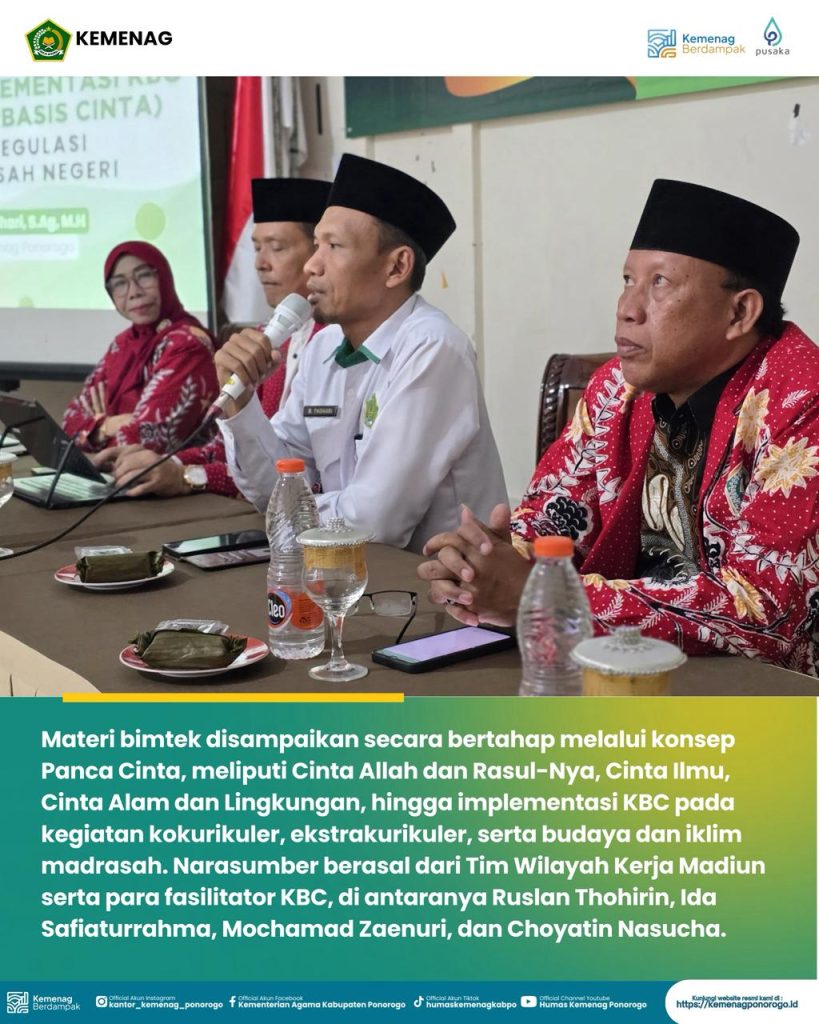 Kegiatan bimtek diawali dengan registrasi peserta, dilanjutkan dengan pembukaan serta penyampaian kebijakan Kementerian Agama tentang Kurikulum Berbasis Cinta oleh Plt. Kepala Kantor Kemenag Kabupaten Ponorogo, Moh. Thohari, S.Ag., M.H. Dalam sambutannya, ia menegaskan bahwa KBC merupakan penguatan karakter peserta didik melalui internalisasi nilai-nilai cinta dalam seluruh proses pendidikan madrasah.