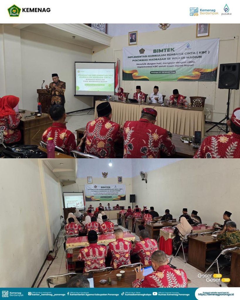 Ponorogo (Humas) — Kantor Kementerian Agama Kabupaten Ponorogo menjadi tuan rumah Bimbingan Teknis Peningkatan Kompetensi Pengawas Madrasah Wilayah Kerja Madiun dalam rangka implementasi Kurikulum Berbasis Cinta (KBC). Kegiatan ini dilaksanakan selama dua hari, Selasa–Rabu, 27–28 Januari 2026, bertempat di kawasan wisata Ngebel, Ponorogo.
