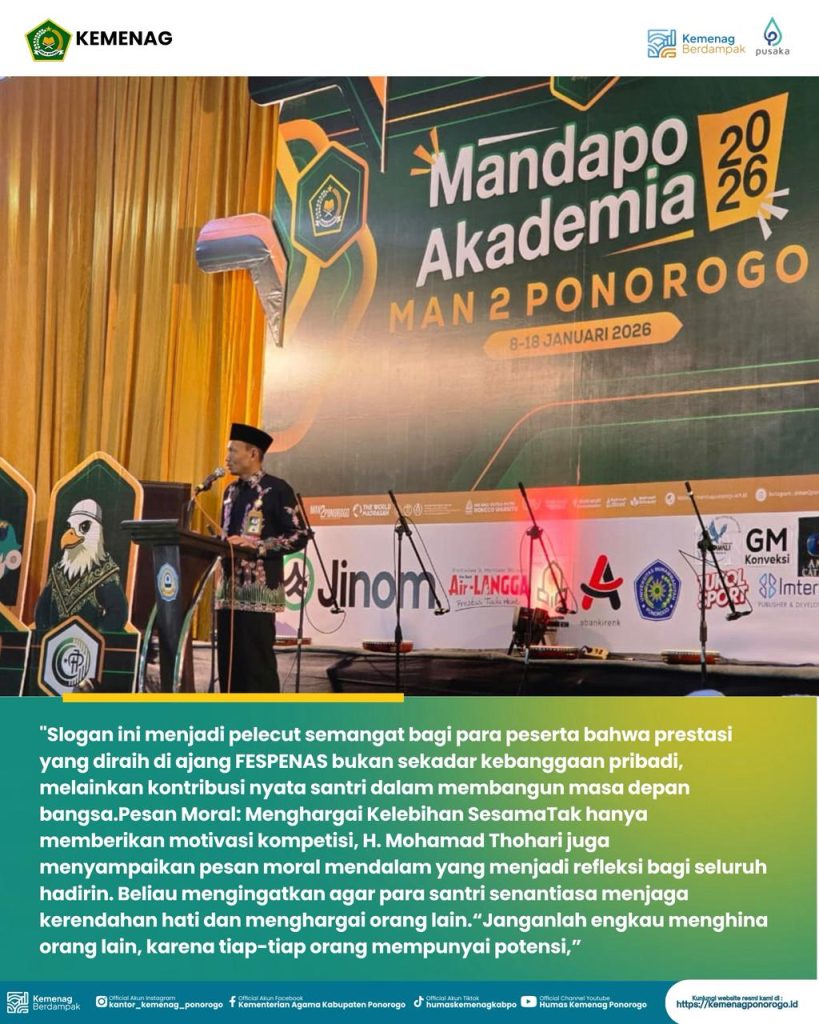 PONOROGO – Suasana khidmat dan penuh semangat menyelimuti halaman MAN 2 Ponorogo pada Kamis (15/1/2026). Pelaksana Tugas (Plt.) Kepala Kantor Kementerian Agama Kabupaten Ponorogo, H. Mohamad Thohari, S.Ag, M.H, secara resmi membuka ajang bergengsi Festival Pesantren Nasional (FESPENAS) II.