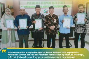 Ponorogo — Pada Selasa, 14 April 2026, Kementerian Agama Kabupaten Ponorogo melalui Kepala Seksi Pendidikan Diniyah dan Pondok Pesantren, H. Ayyub Ahdiyan Syams, menyampaikan apresiasi setinggi-tingginya kepada para pengelola Madrasah Diniyah Takmiliyah (MDT) yang terus berkomitmen dalam menyelenggarakan pendidikan keagamaan bagi masyarakat. Pada kesempatan tersebut, dilakukan penyerahan Izin Operasional Madrasah Diniyah Takmiliyah (IJOP Madin) kepada…
