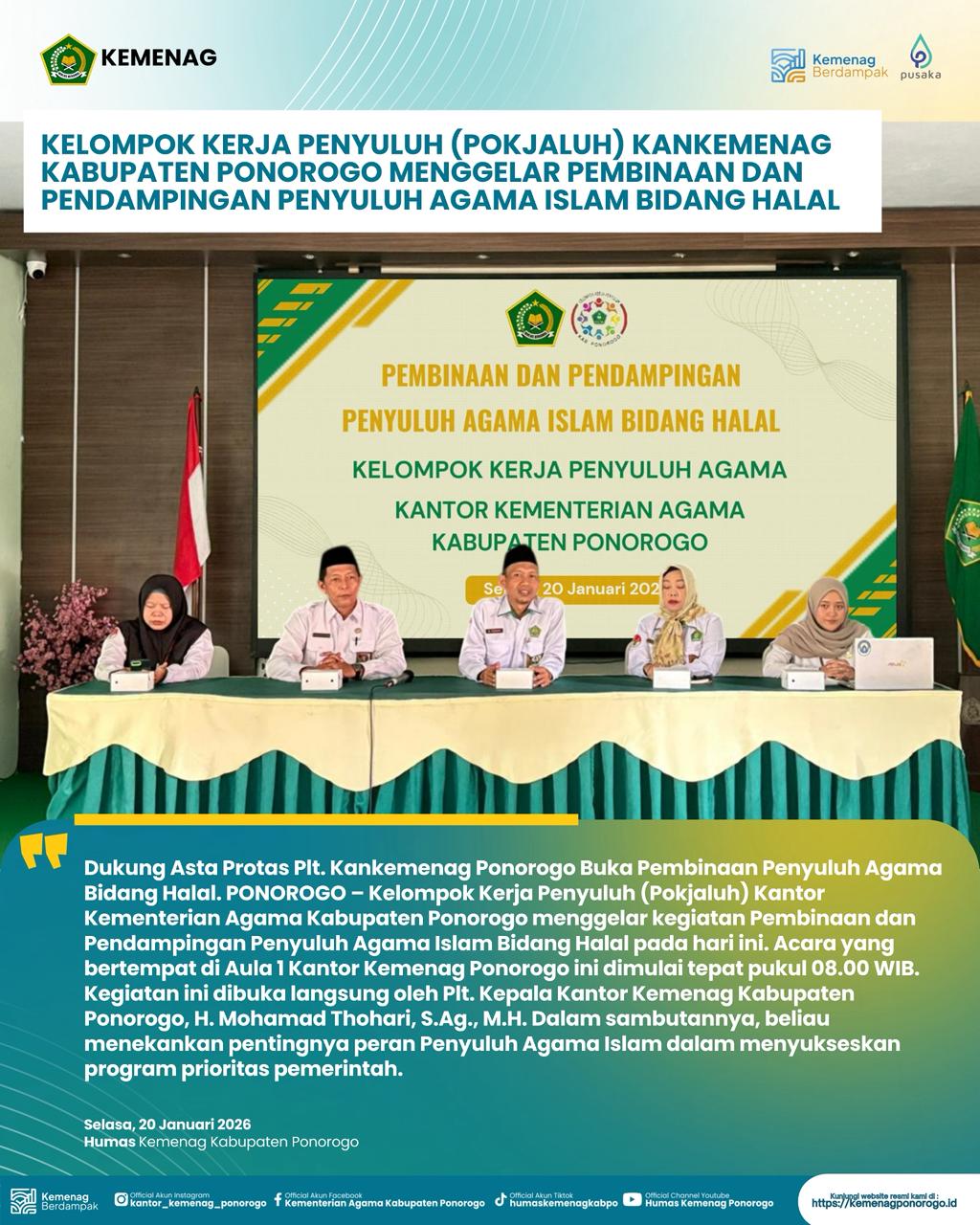 Dengan adanya pembinaan dan pendampingan ini, diharapkan Penyuluh Agama Islam mampu menjadi motor penggerak dalam mewujudkan ekosistem halal yang kuat dan berkelanjutan di Kabupaten Ponorogo, sejalan dengan visi besar Kementerian Agama dalam memberikan pelayanan terbaik kepada umat.