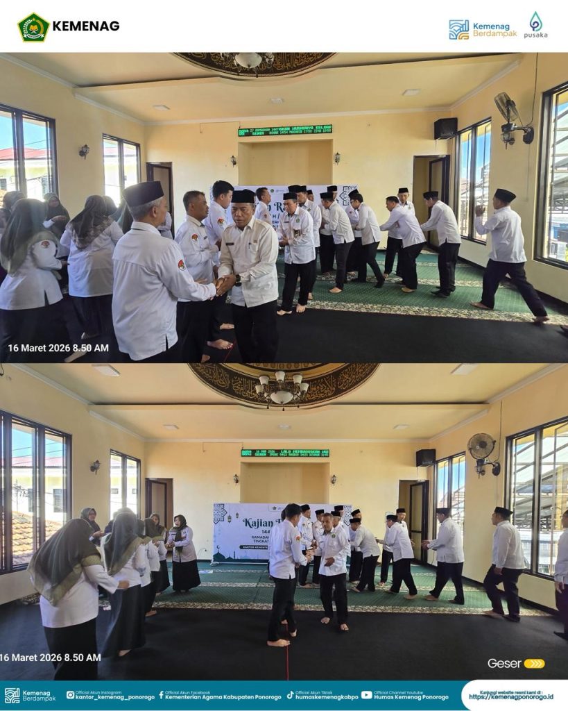 Ponorogo – Senin, 16 Maret 2026, Kementerian Agama Kabupaten Ponorogo menggelar Kajian Ramadan Edisi ke-8 yang sekaligus menjadi penutup seluruh rangkaian kegiatan Ramadan 1447 H di lingkungan Kantor Kementerian Agama Kabupaten Ponorogo. Kegiatan yang diselenggarakan di Masjid Al Ikhlas ini berlangsung khidmat dan diikuti oleh para ASN di lingkungan Kemenag Ponorogo.