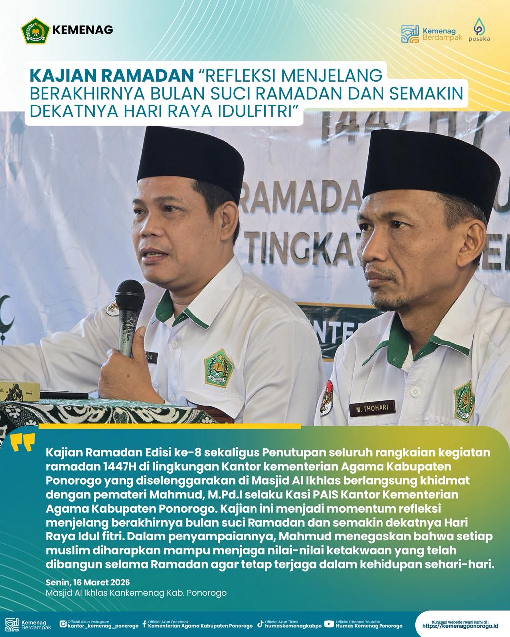 Ponorogo – Senin, 16 Maret 2026, Kementerian Agama Kabupaten Ponorogo menggelar Kajian Ramadan Edisi ke-8 yang sekaligus menjadi penutup seluruh rangkaian kegiatan Ramadan 1447 H di lingkungan Kantor Kementerian Agama Kabupaten Ponorogo. Kegiatan yang diselenggarakan di Masjid Al Ikhlas ini berlangsung khidmat dan diikuti oleh para ASN di lingkungan Kemenag Ponorogo.