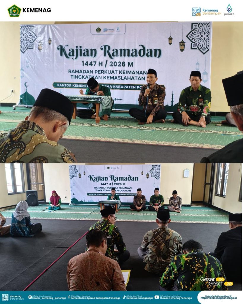 Ponorogo — Kamis, 26 Februari 2026. Kajian Ramadhan edisi ke-2 yang digelar hari ini berlangsung penuh khidmat dan sarat makna. Bertindak sebagai pemateri, H. Marjuni, M.Pd., Kepala Kementerian Haji dan Umroh, menyampaikan tausiyah yang bersumber dari kitab klasik Nashoihul Ibad, khususnya membahas sebuah atsar (perkataan sahabat) yang dinukil dari Ali bin Abi Thalib.