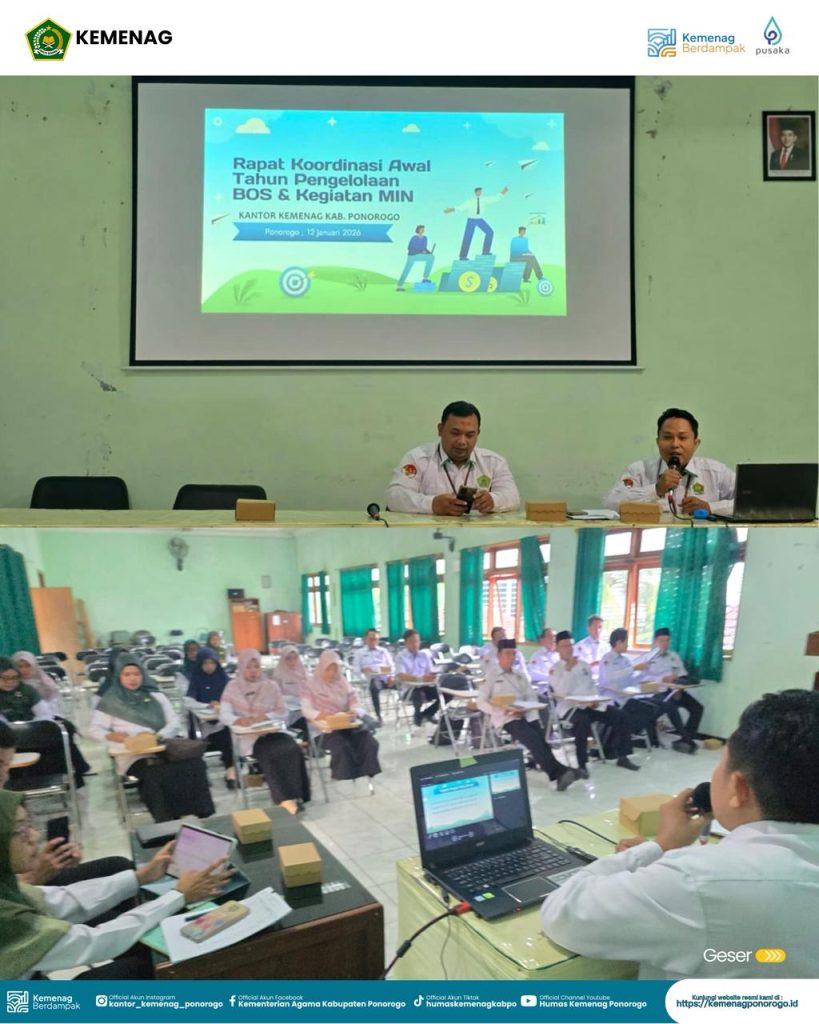 Ponorogo — Kantor Kementerian Agama Kabupaten Ponorogo menyelenggarakan Rapat Koordinasi Awal Tahun Pengelolaan Bantuan Operasional Sekolah (BOS) dan Kegiatan Madrasah Ibtidaiyah Negeri (MIN) pada Senin, 12 Januari 2026. Kegiatan ini dibuka secara resmi oleh Plt. Kepala Kantor Kementerian Agama Kabupaten Ponorogo.