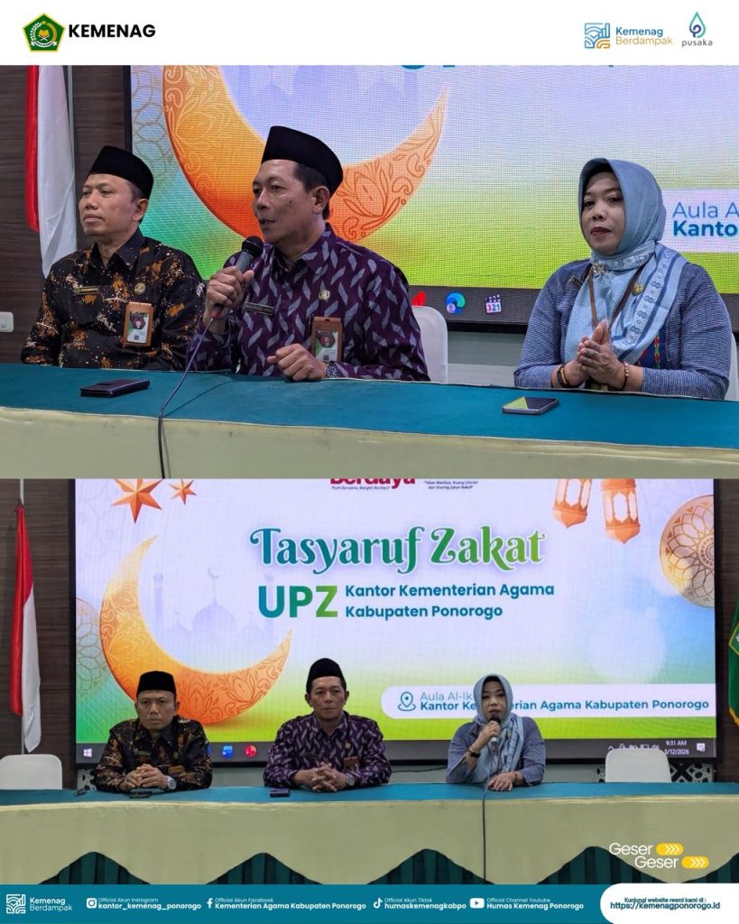 Ponorogo – Kantor Kementerian Agama Kabupaten Ponorogo menggelar kegiatan Tasyaruf Zakat pada Kamis (12/3/2026) di Aula Kemenag Ponorogo. Kegiatan ini merupakan bentuk kepedulian sosial melalui penyaluran zakat profesi kepada para mustahik atau pihak yang berhak menerima.