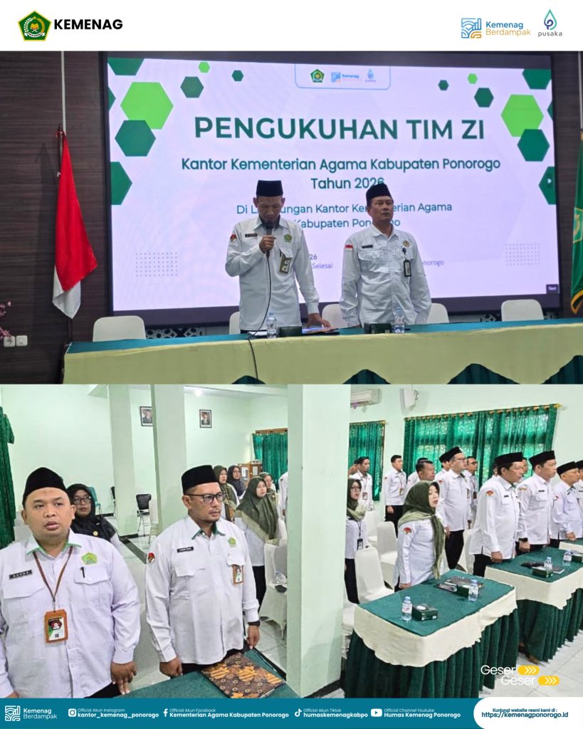 Ponorogo — Kementerian Agama Kabupaten Ponorogo menggelar kegiatan Pengukuhan Tim Zona Integritas (ZI) Tahun 2026 yang dirangkaikan dengan Rapat Koordinasi dan Evaluasi ZI Triwulan I Tahun 2026 pada Senin (13/04/2026).