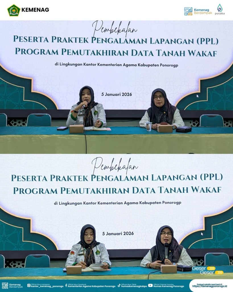 Kantor Kementerian Agama Kabupaten Ponorogo menyelenggarakan kegiatan Pembekalan Peserta Praktek Pengalaman Lapangan (PPL) dalam rangka Program Pemutakhiran Data Tanah Wakaf, pada Senin, 5 Januari 2026. Kegiatan ini bertujuan untuk memperkuat legalitas aset wakaf sekaligus mendorong produktivitas pengelolaan zakat dan wakaf di tengah masyarakat.