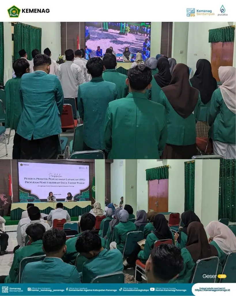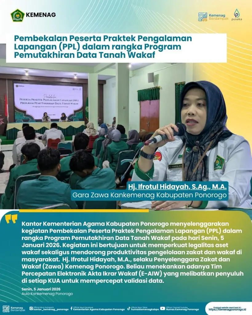 Kantor Kementerian Agama Kabupaten Ponorogo menyelenggarakan kegiatan Pembekalan Peserta Praktek Pengalaman Lapangan (PPL) dalam rangka Program Pemutakhiran Data Tanah Wakaf, pada Senin, 5 Januari 2026. Kegiatan ini bertujuan untuk memperkuat legalitas aset wakaf sekaligus mendorong produktivitas pengelolaan zakat dan wakaf di tengah masyarakat.