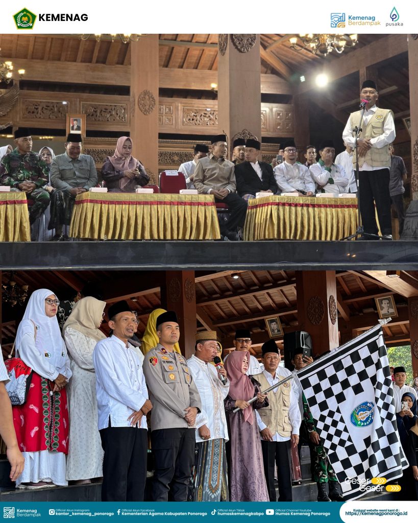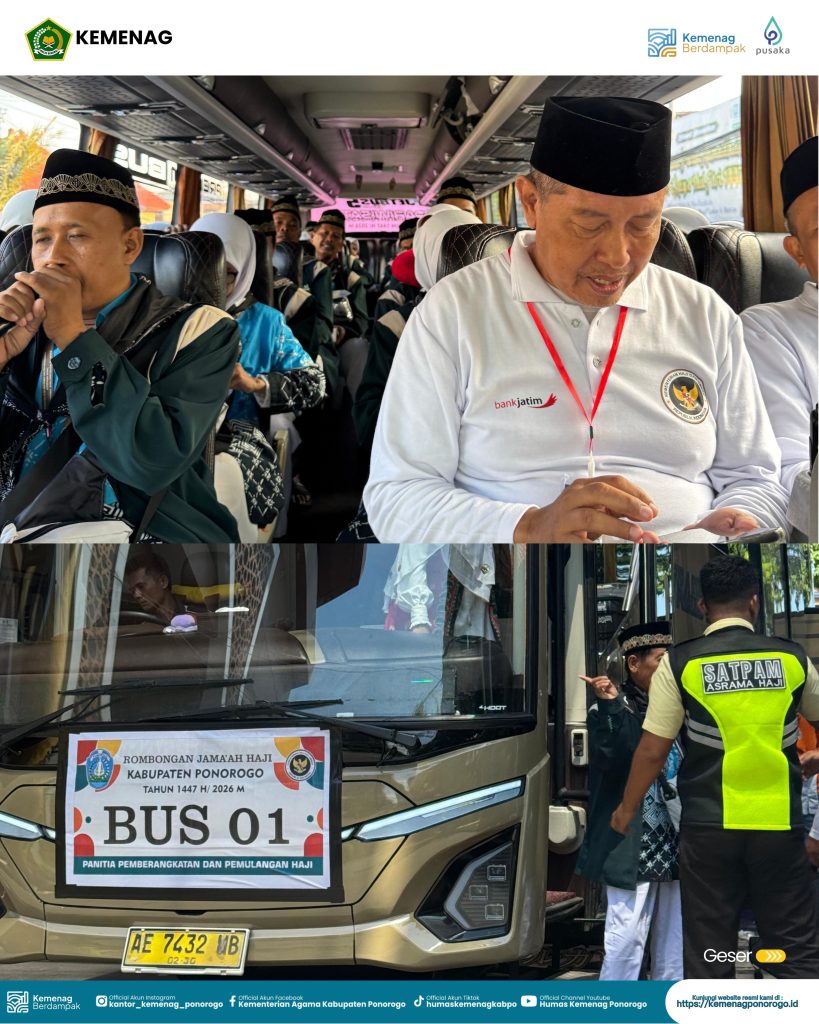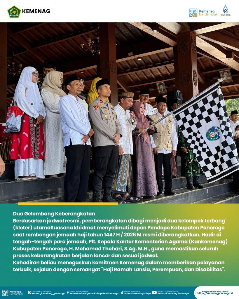 Ponorogo – Suasana khidmat menyelimuti depan Pendopo Kabupaten Ponorogo saat rombongan jemaah haji tahun 1447 H / 2026 M resmi diberangkatkan. Momentum penuh haru ini dihadiri langsung oleh Plt. Kepala Kantor Kementerian Agama (Kankemenag) Kabupaten Ponorogo, H. Mohamad Thohari, S.Ag., M.H., yang turut memastikan seluruh proses keberangkatan berjalan lancar dan sesuai jadwal.
