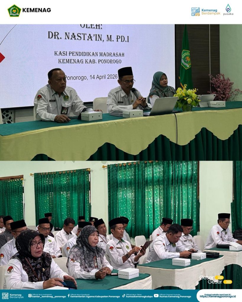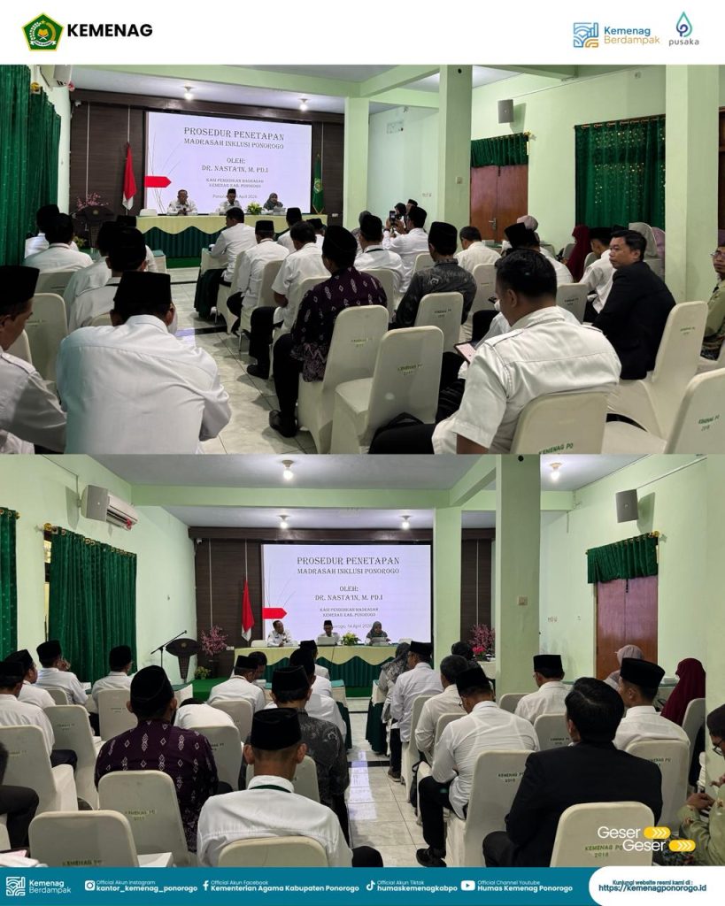Ponorogo — Seksi Pendidikan Madrasah (Pendma) Kementerian Agama Kabupaten Ponorogo menggelar kegiatan penguatan calon madrasah penyelenggara pendidikan inklusi pada Selasa, 14 April 2026. Kegiatan ini berlangsung di Aula Kemenag Ponorogo dan dihadiri oleh para kepala Madrasah Ibtidaiyah (MI) serta Madrasah Tsanawiyah (MTs) negeri dan swasta se-Kabupaten Ponorogo.