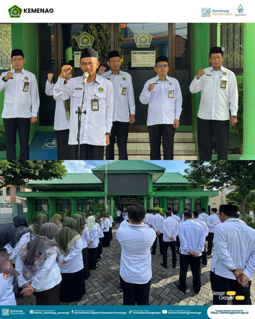 Ponorogo – Kepala Seksi Pendidikan Madrasah (Kasi Pendma) Kantor Kementerian Agama Kabupaten Ponorogo, Dr. Nastain, M.Pd., memimpin apel pagi rutin yang digelar pada Senin (27/04/2026). Kegiatan ini diikuti oleh seluruh pegawai sebagai bagian dari upaya menjaga kedisiplinan dan koordinasi kerja di lingkungan Kankemenag.