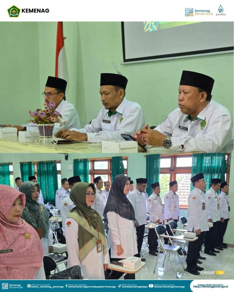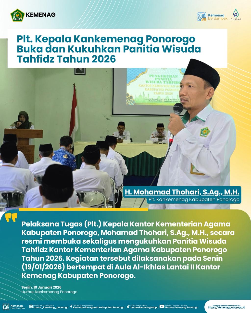 PONOROGO — Pelaksana Tugas (Plt.) Kepala Kantor Kementerian Agama Kabupaten Ponorogo, Mohamad Thohari, S.Ag., M.H., secara resmi membuka sekaligus mengukuhkan Panitia Wisuda Tahfidz Kantor Kementerian Agama Kabupaten Ponorogo Tahun 2026. Panitia tersebut terdiri dari kepala madrasah satuan kerja negeri dan guru Pendidikan Agama, serta dihadiri para Kepala Seksi (Kasi) dan Ketua Kelompok Pengawas (Pokjawas).