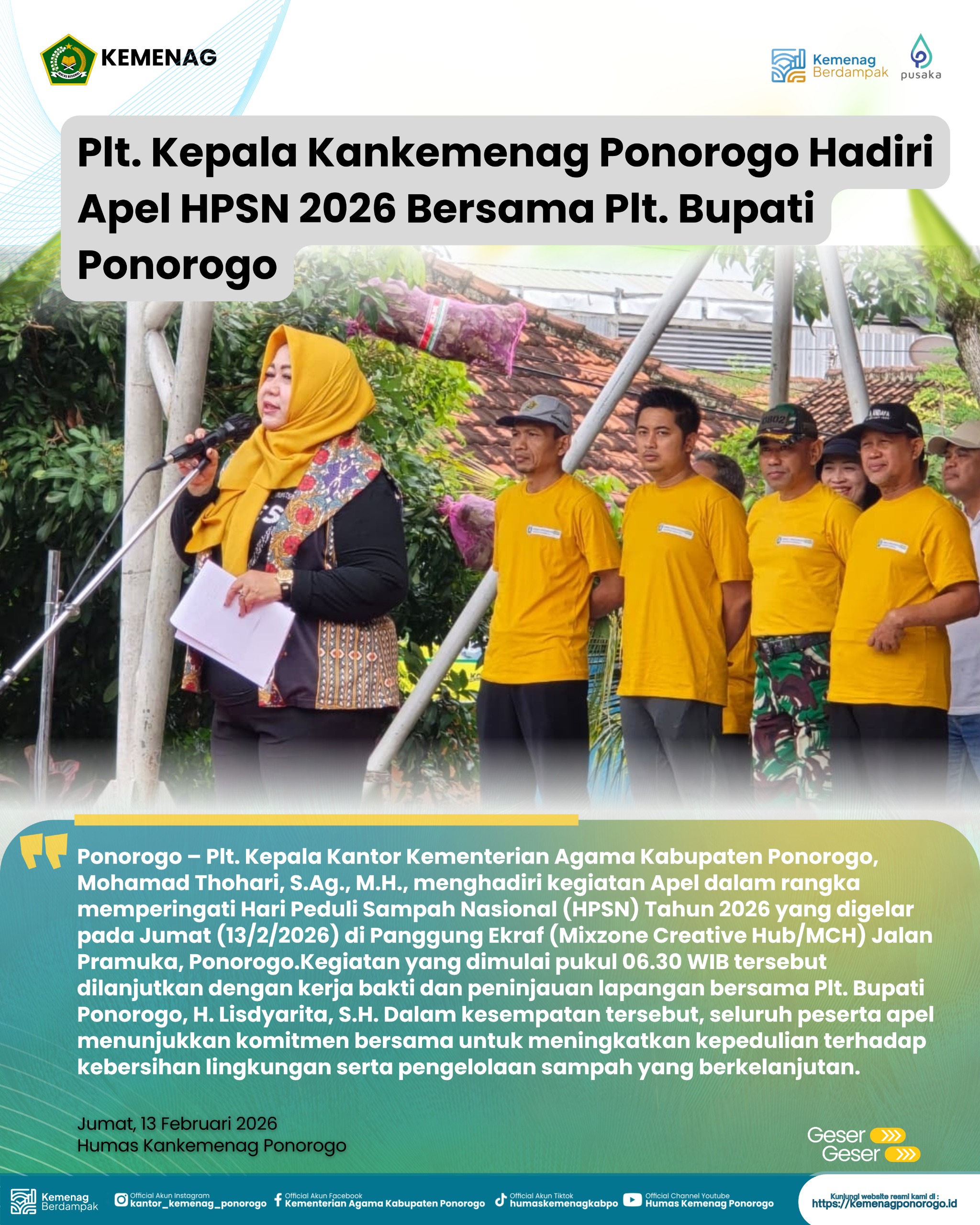 Ponorogo – Plt. Kepala Kantor Kementerian Agama Kabupaten Ponorogo, H. Mohamad Thohari, S.Ag., M.H., menghadiri kegiatan Apel dalam rangka memperingati Hari Peduli Sampah Nasional (HPSN) Tahun 2026 yang digelar pada Jumat (13/2/2026) di Panggung Ekraf (Mixzone Creative Hub/MCH), Jalan Pramuka, Ponorogo.