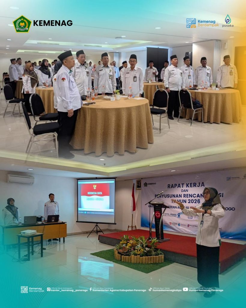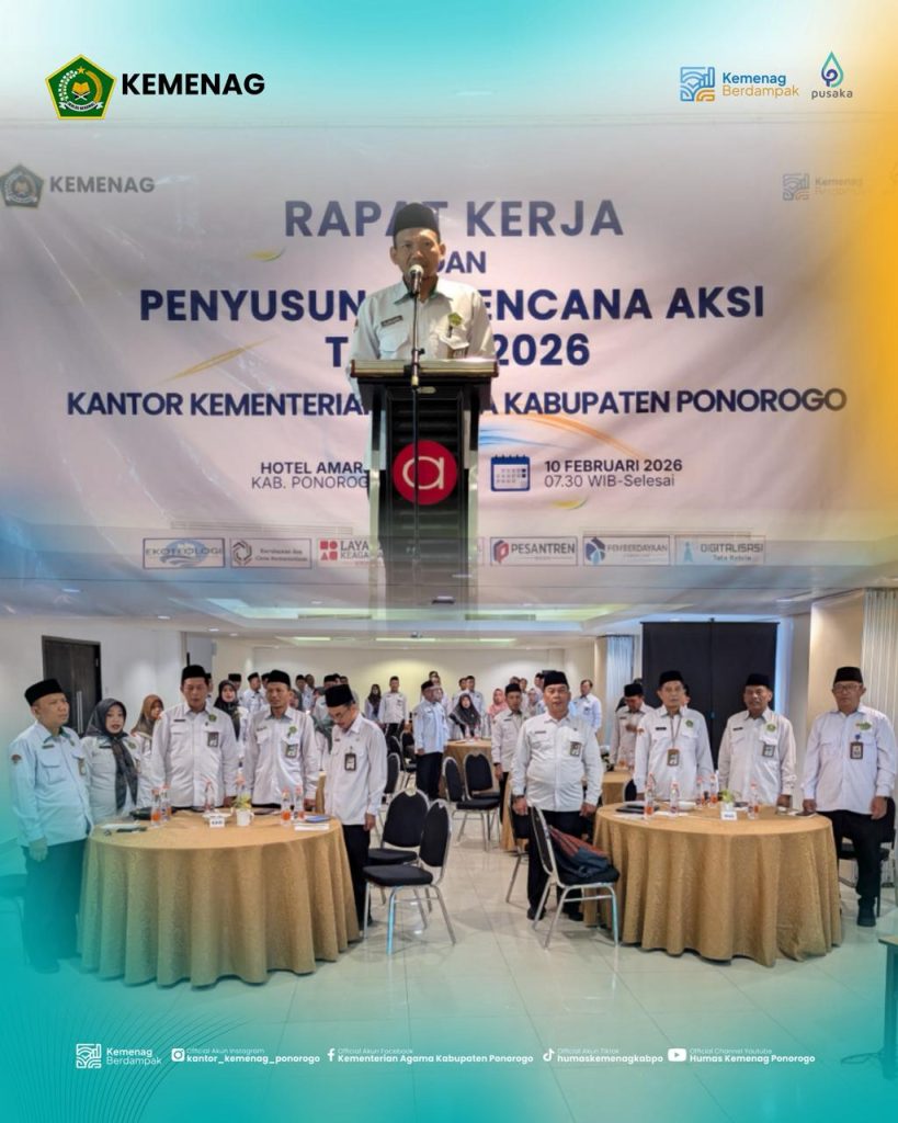 Kegiatan Raker berlangsung dengan penuh semangat kebersamaan dan diikuti oleh seluruh pejabat struktural, pengawas, kepala madrasah, serta jajaran terkait di lingkungan Kantor Kementerian Agama Kabupaten Ponorogo. Melalui Rapat Kerja ini, diharapkan seluruh program dan kegiatan Tahun 2026 dapat terlaksana secara optimal, selaras dengan kebijakan pusat, serta memberikan manfaat sebesar-besarnya bagi masyarakat Kabupaten Ponorogo.