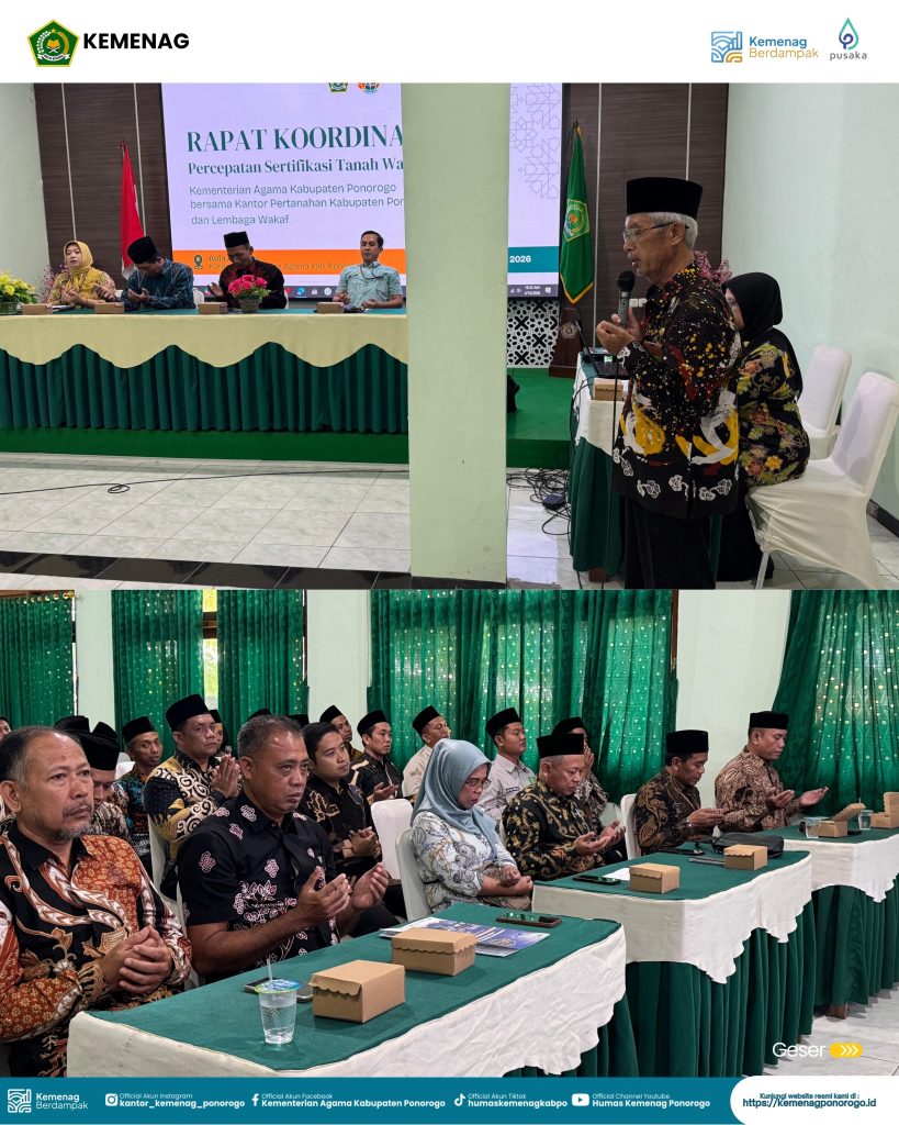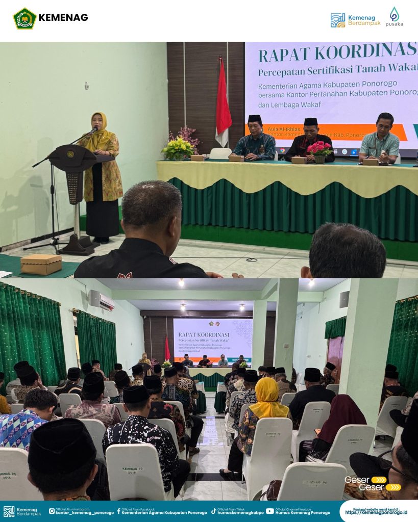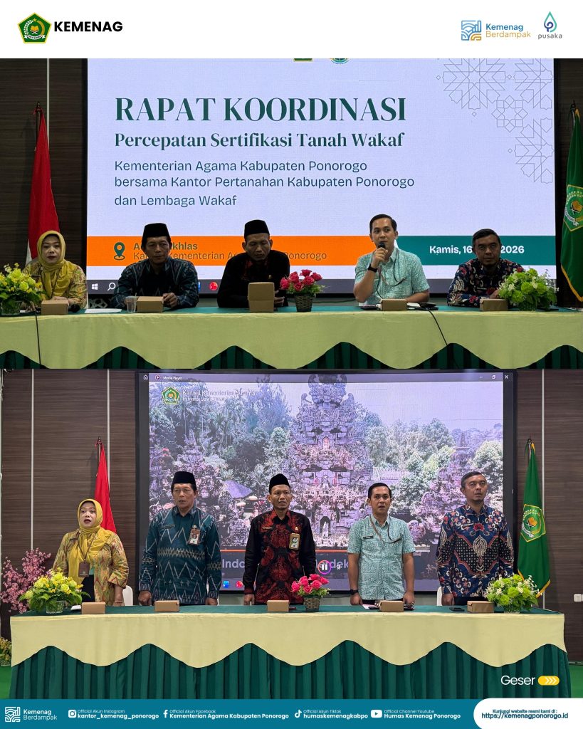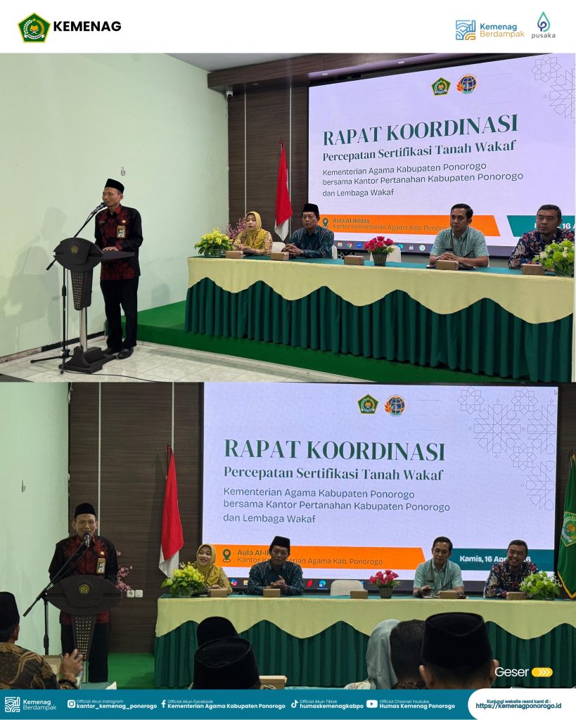 Ponorogo, Kamis (16/4/2026) — Rapat Koordinasi (Rakor) percepatan sertifikasi tanah wakaf diselenggarakan di Aula Al Ikhlas Kantor Kementerian Agama Kabupaten Ponorogo. Kegiatan ini menjadi wujud komitmen bersama dalam mempercepat proses sertifikasi tanah wakaf guna memberikan kepastian hukum serta meningkatkan pemanfaatannya bagi kesejahteraan umat.