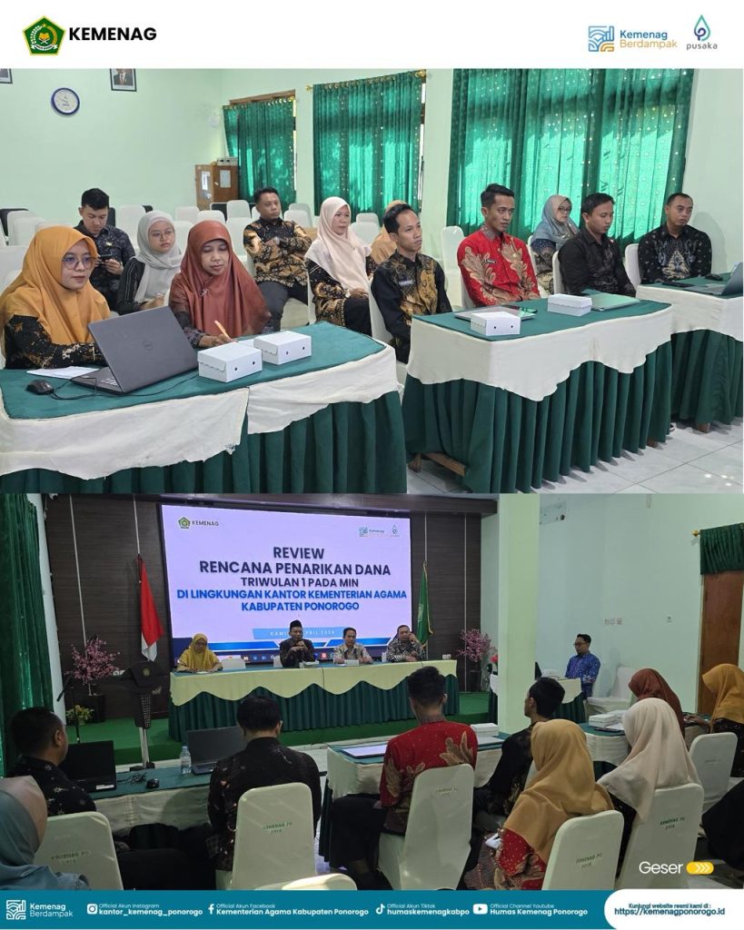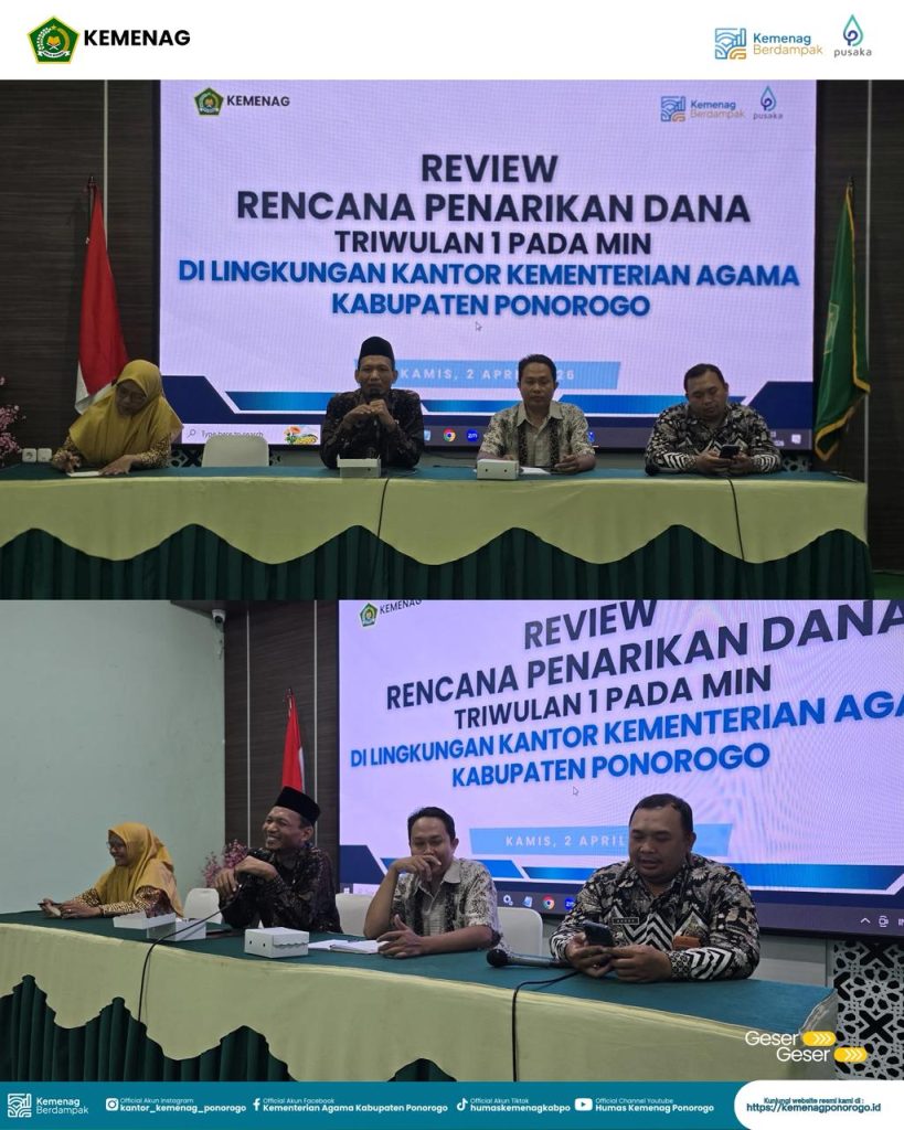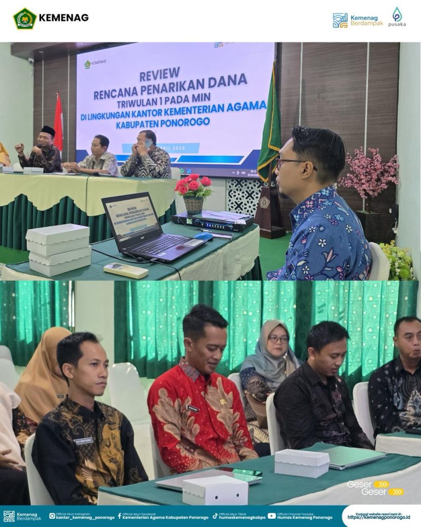 Pelaksana Tugas (Plt) Kepala Kantor Kementerian Agama Kabupaten Ponorogo, Mohamad Thohari, S.Ag., M.H., secara resmi membuka kegiatan Review Rencana Penarikan Dana Triwulan I pada Madrasah Ibtidaiyah Negeri (MIN), Kamis (2/4/2026). Kegiatan tersebut digelar di Aula Kantor Kemenag Kabupaten Ponorogo dan diikuti oleh bendahara serta operator keuangan MIN, pengelola keuangan, dan perencana di lingkungan Kemenag Ponorogo.