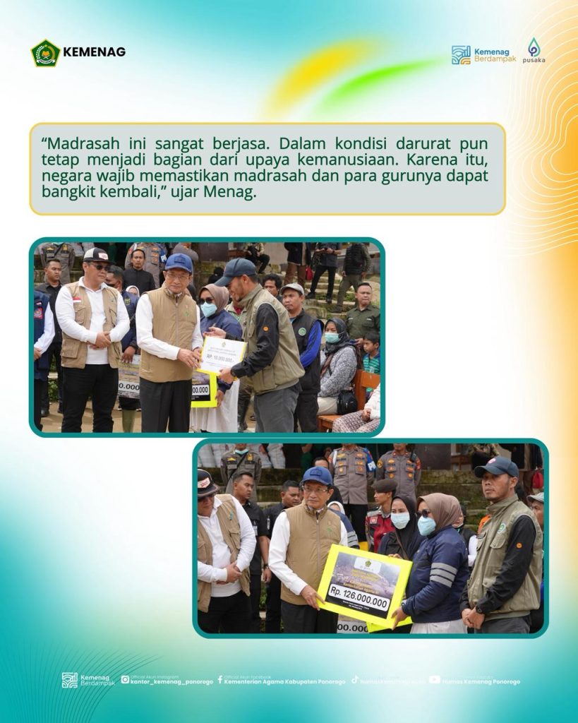 “Madrasah ini sangat berjasa. Dalam kondisi darurat pun tetap menjadi bagian dari upaya kemanusiaan. Karena itu, negara wajib memastikan madrasah dan para gurunya dapat bangkit kembali,” ujar Menag.