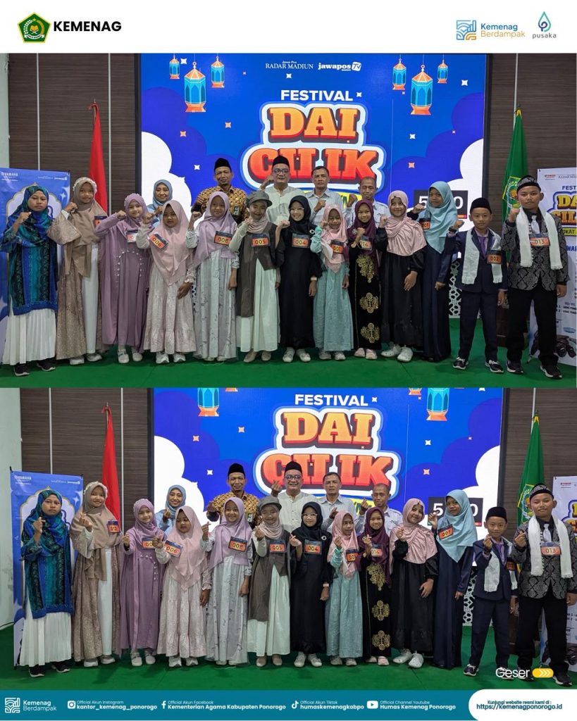 Ponorogo (Kemenag) — Pelaksana Tugas (Plt) Kepala Kantor Kementerian Agama Kabupaten Ponorogo menegaskan pentingnya menanamkan nilai dan semangat dakwah kepada generasi muda sejak usia dini. Hal tersebut disampaikan dalam sambutannya pada kegiatan Festival Dai Cilik tingkat SD/MI yang berlangsung meriah dan penuh antusiasme.